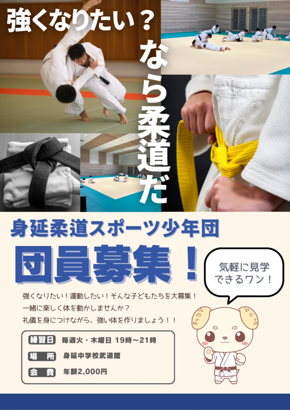 身延町スポーツ協会 > 専門部の投稿 > 【柔道スポ少】団員募集チラシを作りました!! 2025年12月5日カテゴリー: 専門部の投稿 【柔道スポ少】団員募集チラシを作りました!! スポ少の団員募集のため、チラシを作ってみました!! 町内の学童保育へ掲示してもらっていますので、ぜひ見てみてくださいね~~! 身延柔道スポーツ少年団では、いつでも団員を募集しています! 「少年団」と名乗っていますが、大人の方も大歓迎です!! 体を動かしたい、強い体を作りたいという方、ぜひ練習風景を覗いてみてくださいね~ 詳細は☛こちらから!!